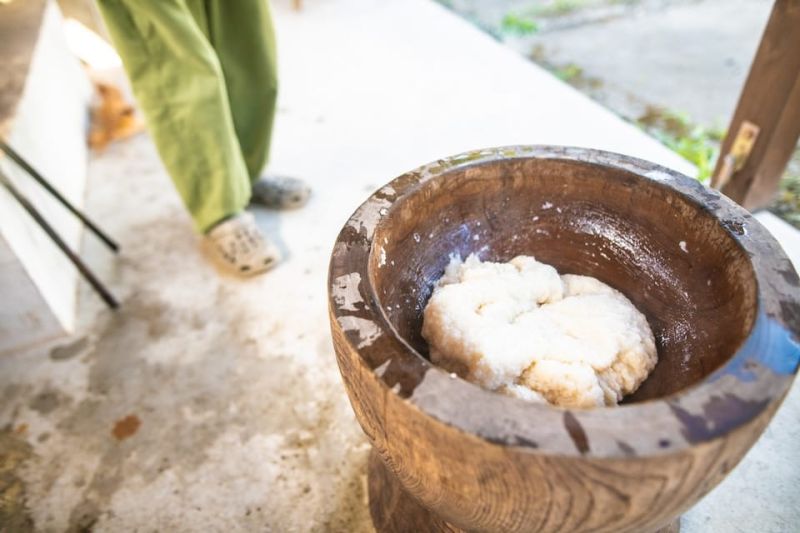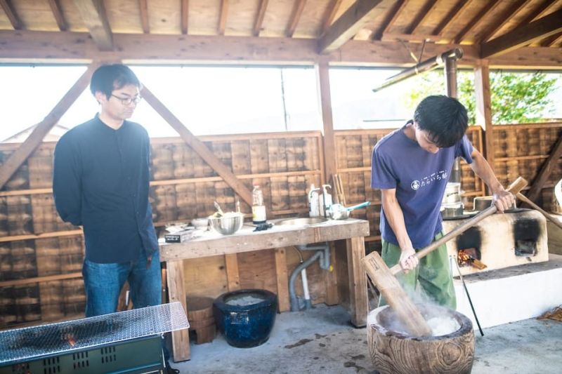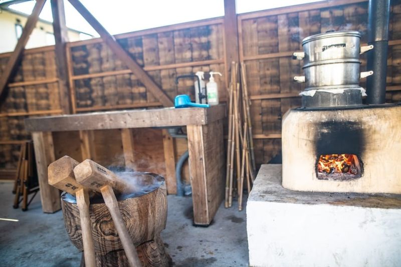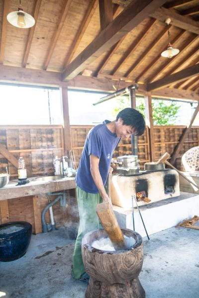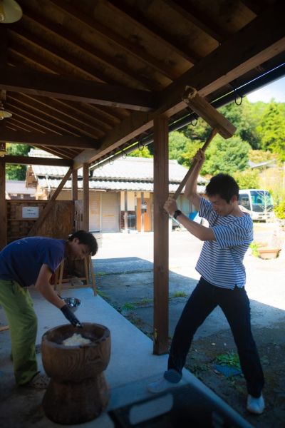 Steamed sticky rice from the kamado is pounded with traditional kine and usu.